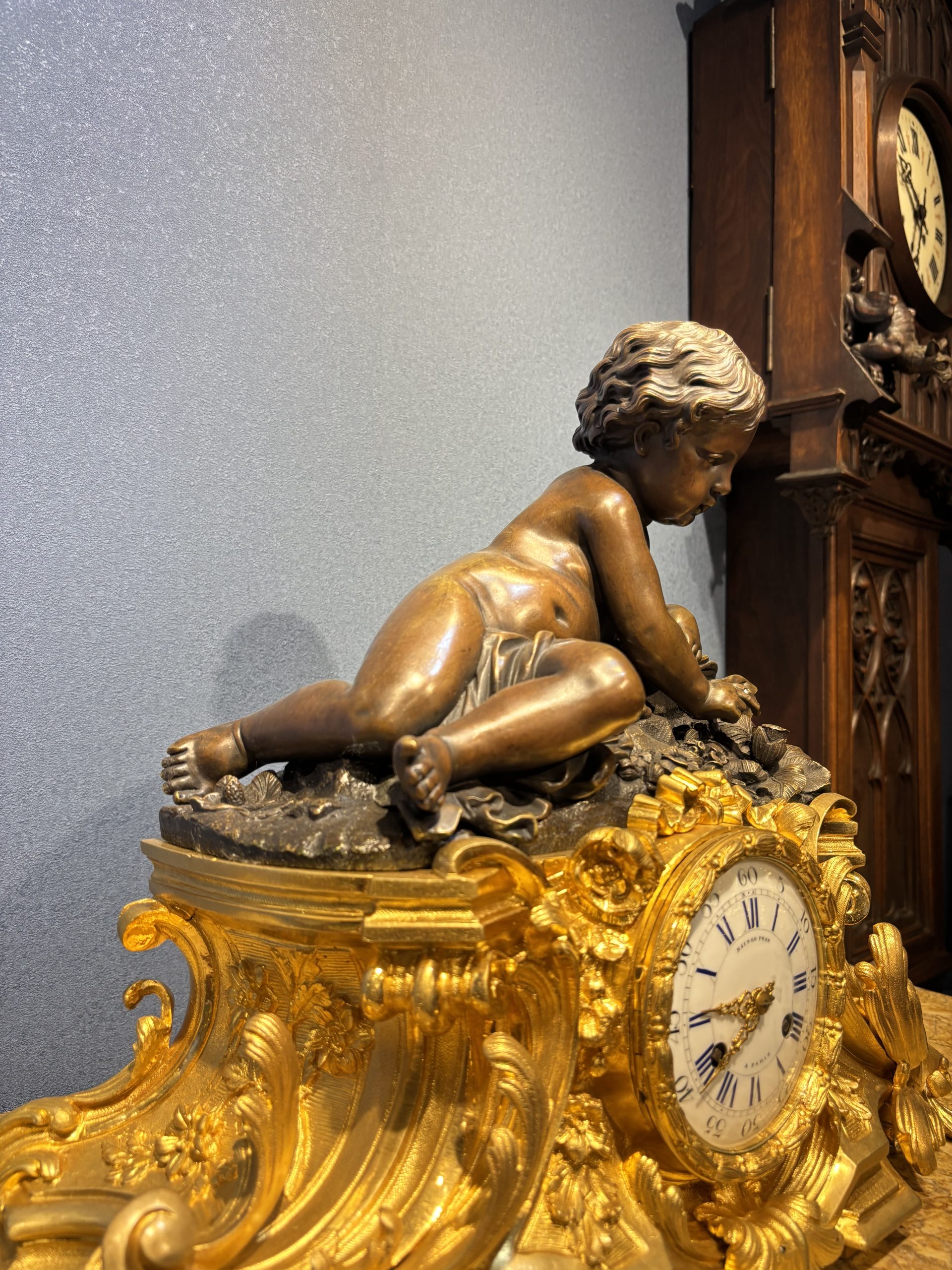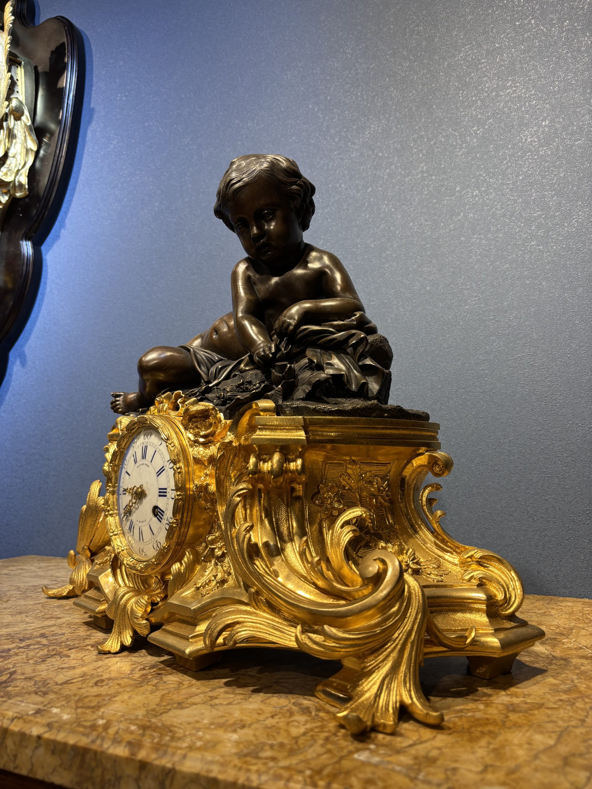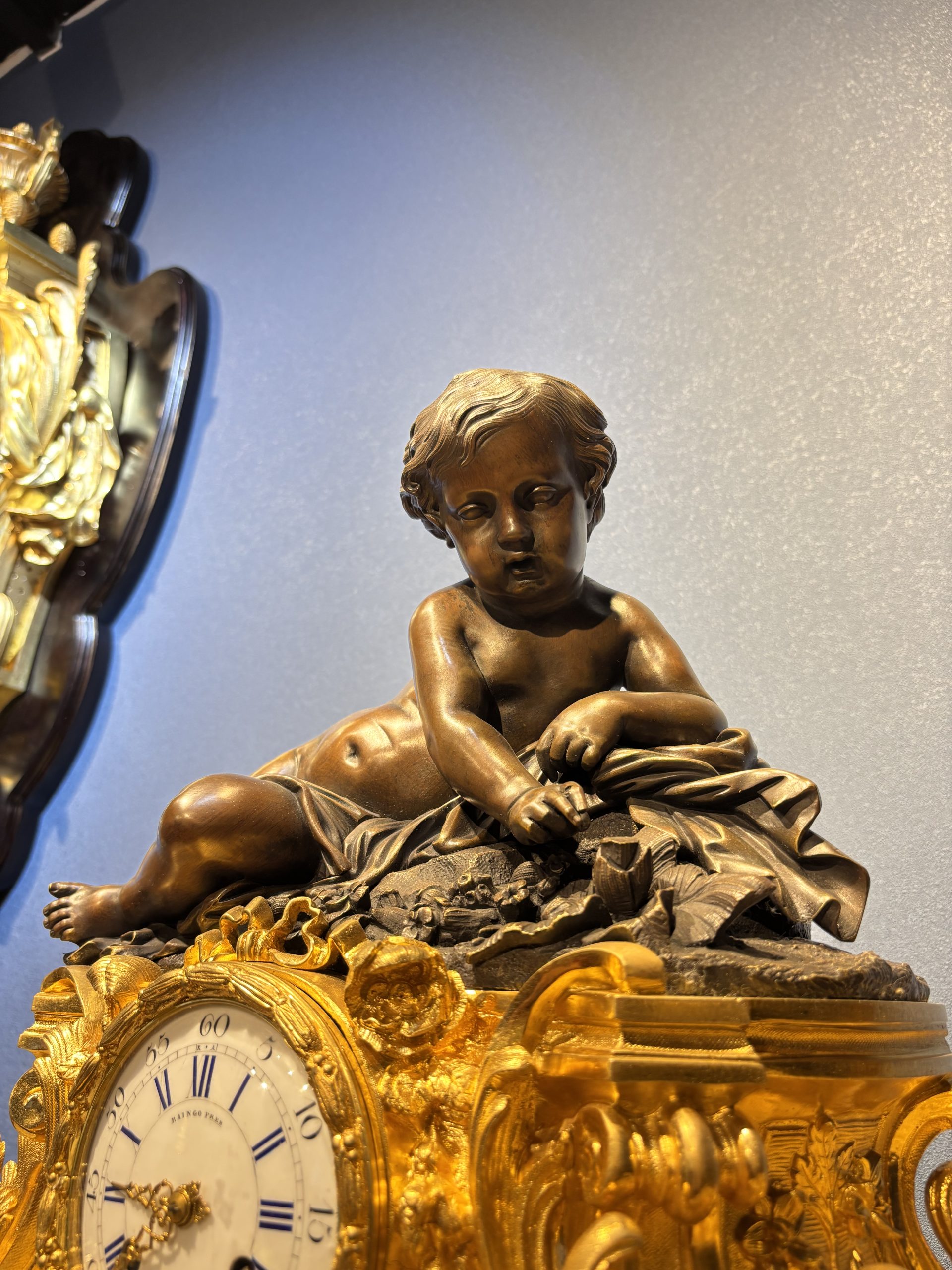 • Bức tượng mô tả “Thiên thần nhỏ đang đang nghỉ ngơi sau những giây phút hoạt động, lô đùa” vào khoảng năm 1860. Tác phẩm được làm bằng đồng thau, đồng đen mun của Henri Picard, Ông được biết đến là người thợ chế tác và mạ vàng nổi tiếng ở Paris (1831-1864), Ông làm việc cho nhiều nhân vật quan trọng, bao gồm cả Hoàng đế Napoleon III. Vì vậy, các tác phẩm của ông rất nổi tiếng và giá trị cao.