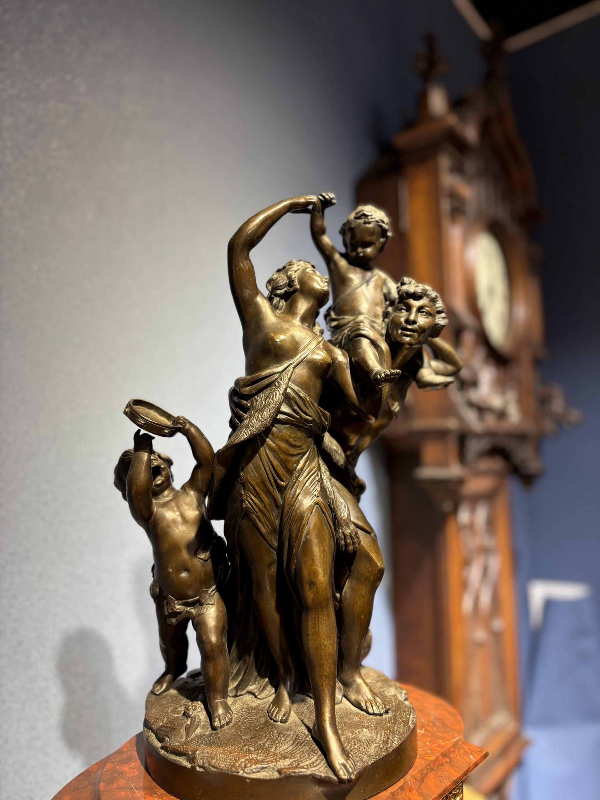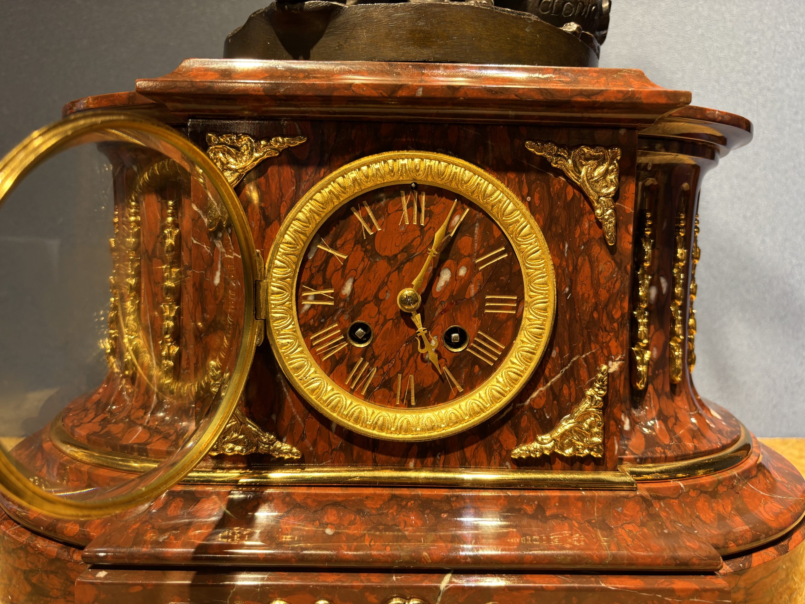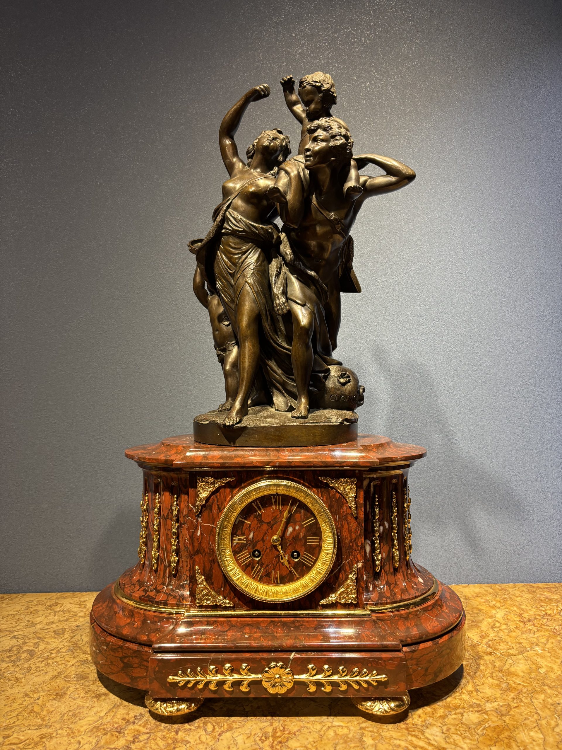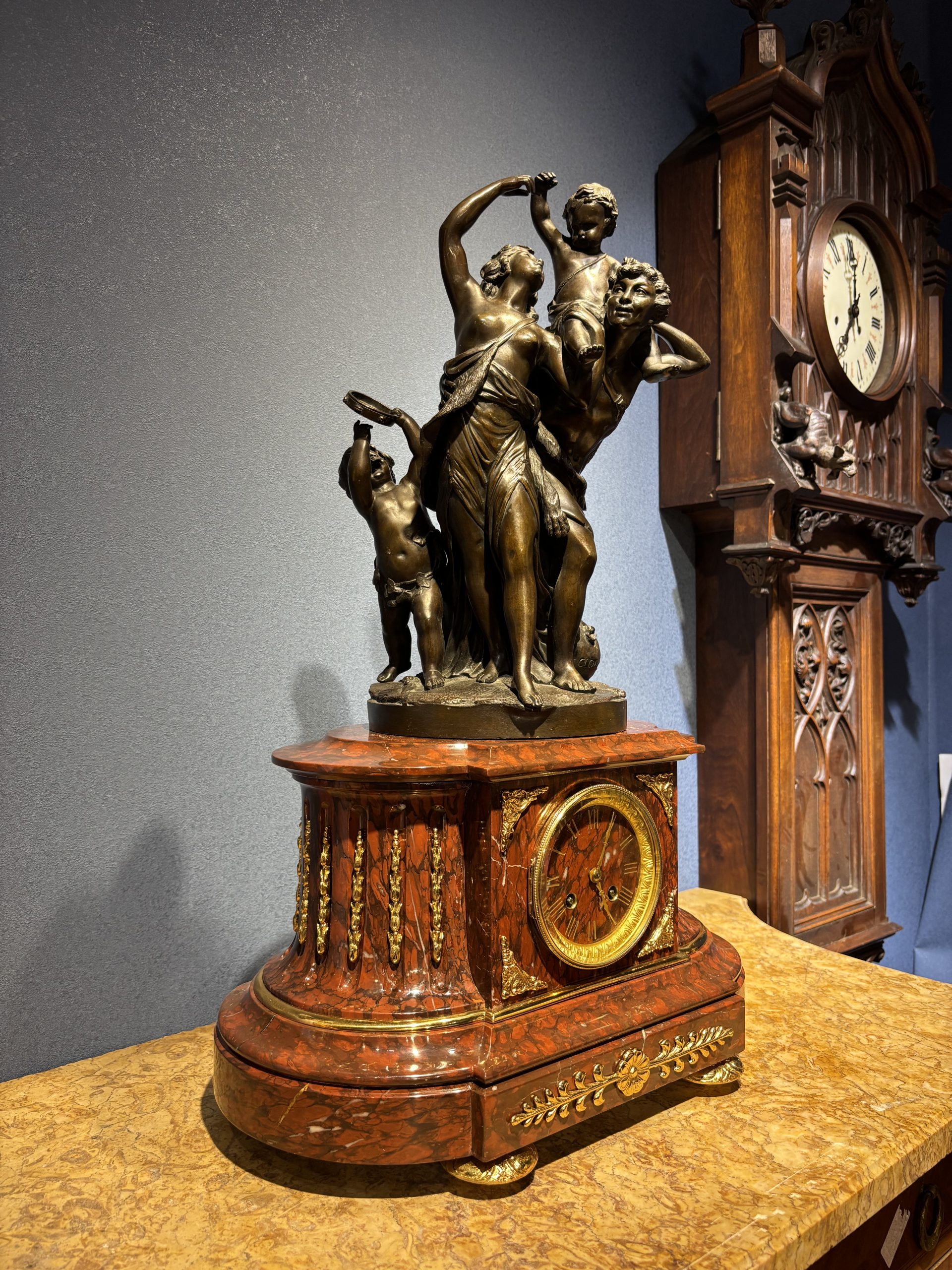 – Tượng được tác giả điêu khắc bằng đồng thau, màu đen mun cùng với sự kết hợp với đá cẩm thạch đỏ vân, chi tiết mặt số mạ vàng lắc kê và sử dụng bộ máy cơ khí hoàn hảo, đặc biệt có phần chiện đạt “Huy chương danh dự cao quý” vào năm 1880 của thương hiệu Japy.